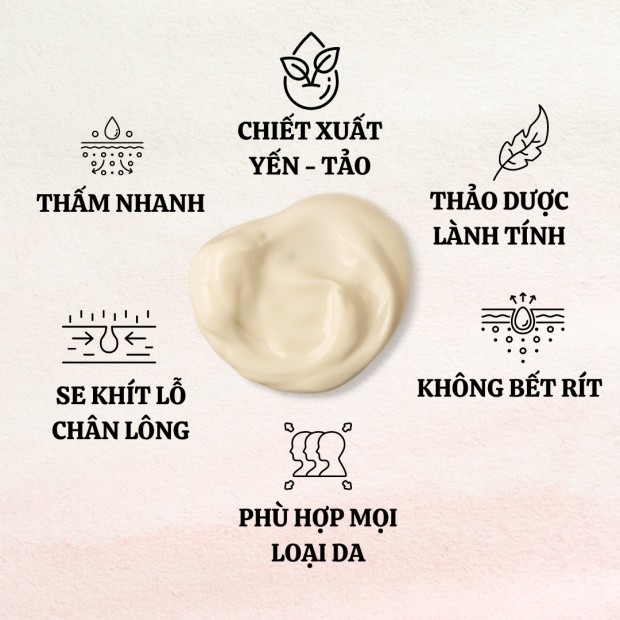 Đặc biệt, kem body thảo dược Yến – Tảo thấm nhanh không cảm giác bết dính, giải quyết triệt để cảm giác nhờn rít như các loại kem body khác mà bạn đã từng sử dụng, thay vào đó là một mùi thơm vừa đủ, nhẹ nhàng, không gây kích ứng.